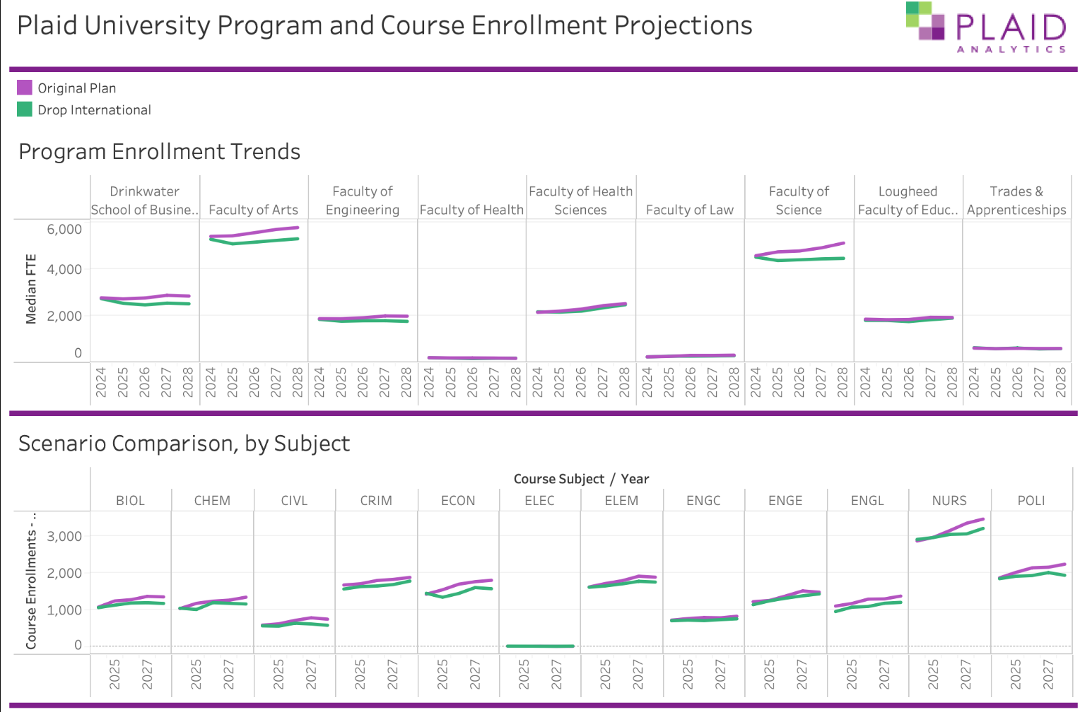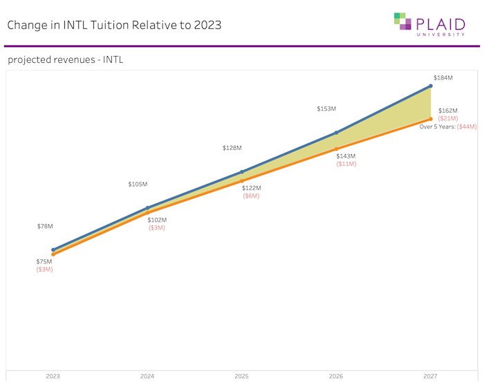 If I were a Provost, I'd be asking my Institutional Research team to game out what these scenarios might look like compared to our current plans. Here's what we were expecting at Plaid University:...