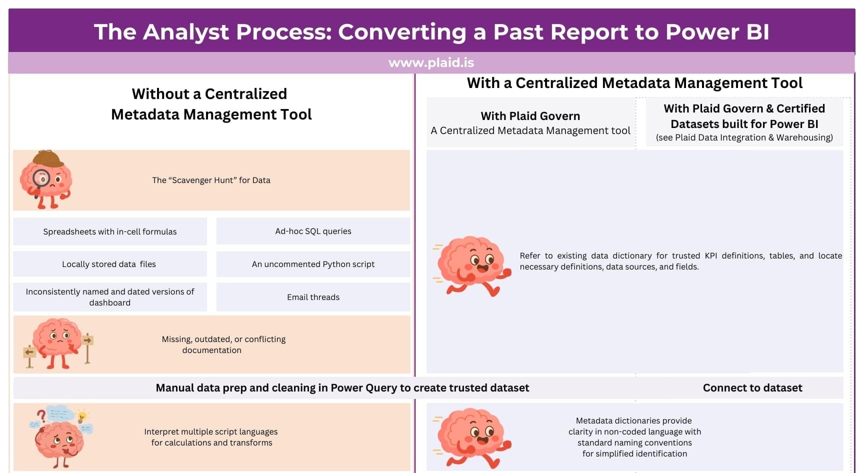 While the initial lift of getting data set up for Power BI is going to be time-consuming, you'll get compounding returns as developing new dashboards gets faster. What happens with and without a centralized metadata management tool when an analyst is asked to transfer an existing report to Power BI:...