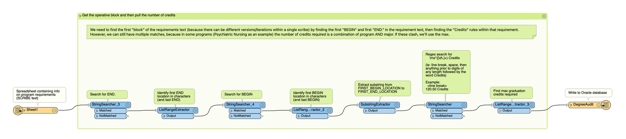 Instead, I use visual workflows for my data integrations. What does a visual workflow look like? Here’s an example we presented at the FME user conference in partnership with Jessica Maitland, an Associate Registrar at Douglas College in Vancouver, Canada. It shows how we picked apart program requirements written as code (called Scribing).
