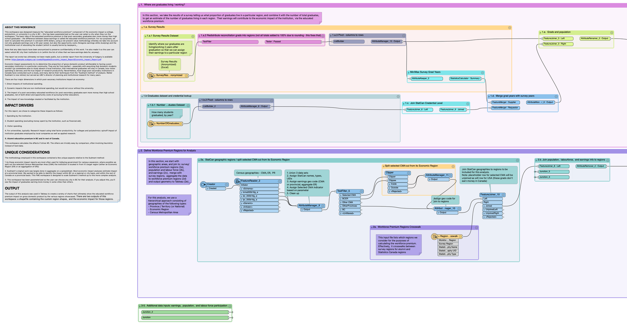 You can also do neat things with data integration tools. Here’s part of the flow for generating an economic impact for a college, polytechnic, or university in British Columbia, Canada. It combines institutional data (survey responses, number of graduates, financials) with data from Statistics Canada (geographic regions, earnings by credential, population, labour force participation, and so on). In this example, I pretended the university I worked with is in Prince George (this is fake data, though there is a great university there).