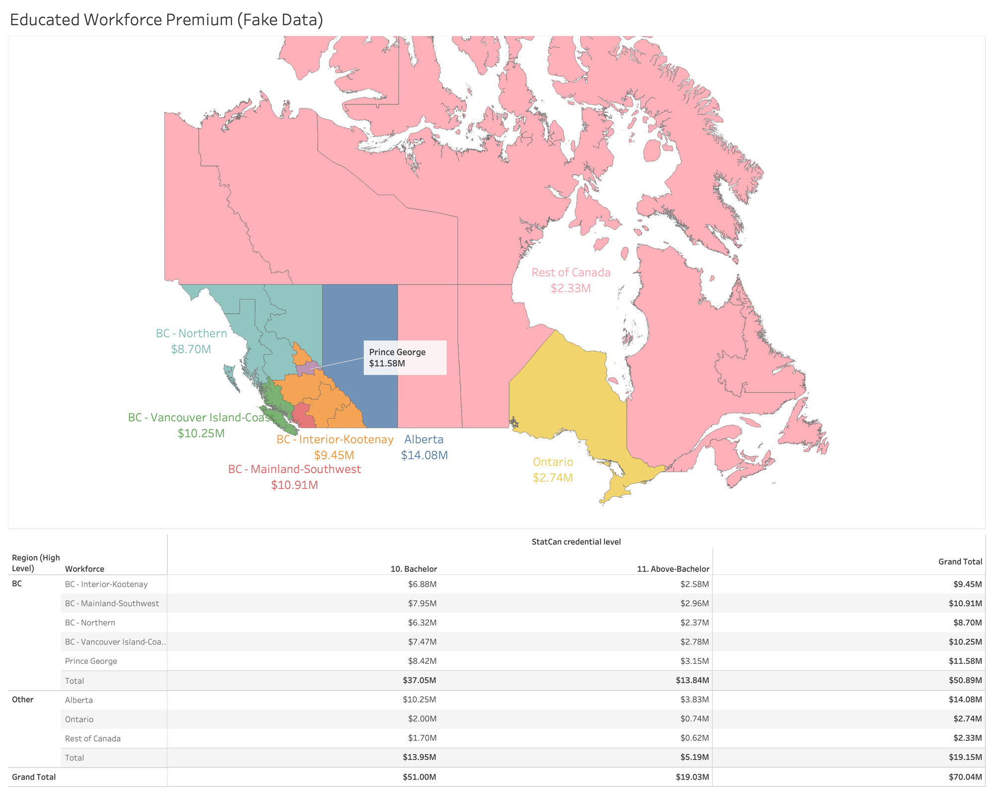 The map displays the earnings premium associated with completing a bachelor’s or higher degree, within each colour coded region.